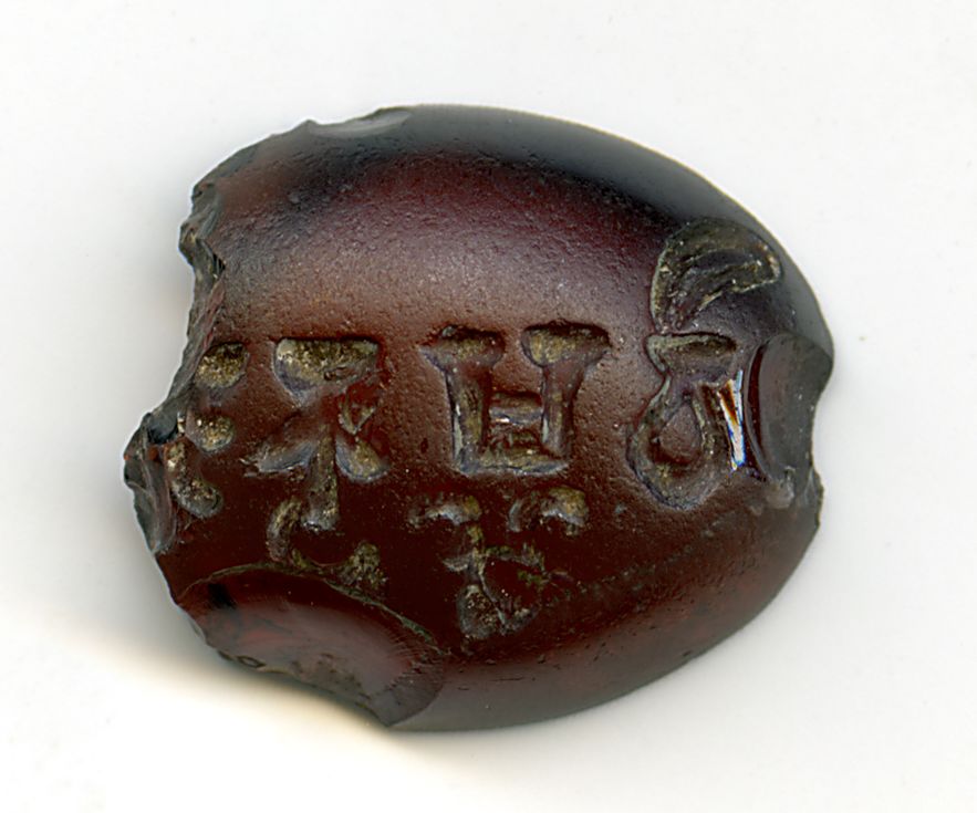 Oval garnet intaglio with a hollowed back, engraved on the face with a one-line brāhmī inscription; broken. British Museum 1892,1103.132.