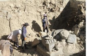 སྐར་ཅུང། Site of the Skar Cung pillar in the process of being cleared, showing parts of the base, with rectangular socket for the pillar proper, and broken portions of the crowning elements.